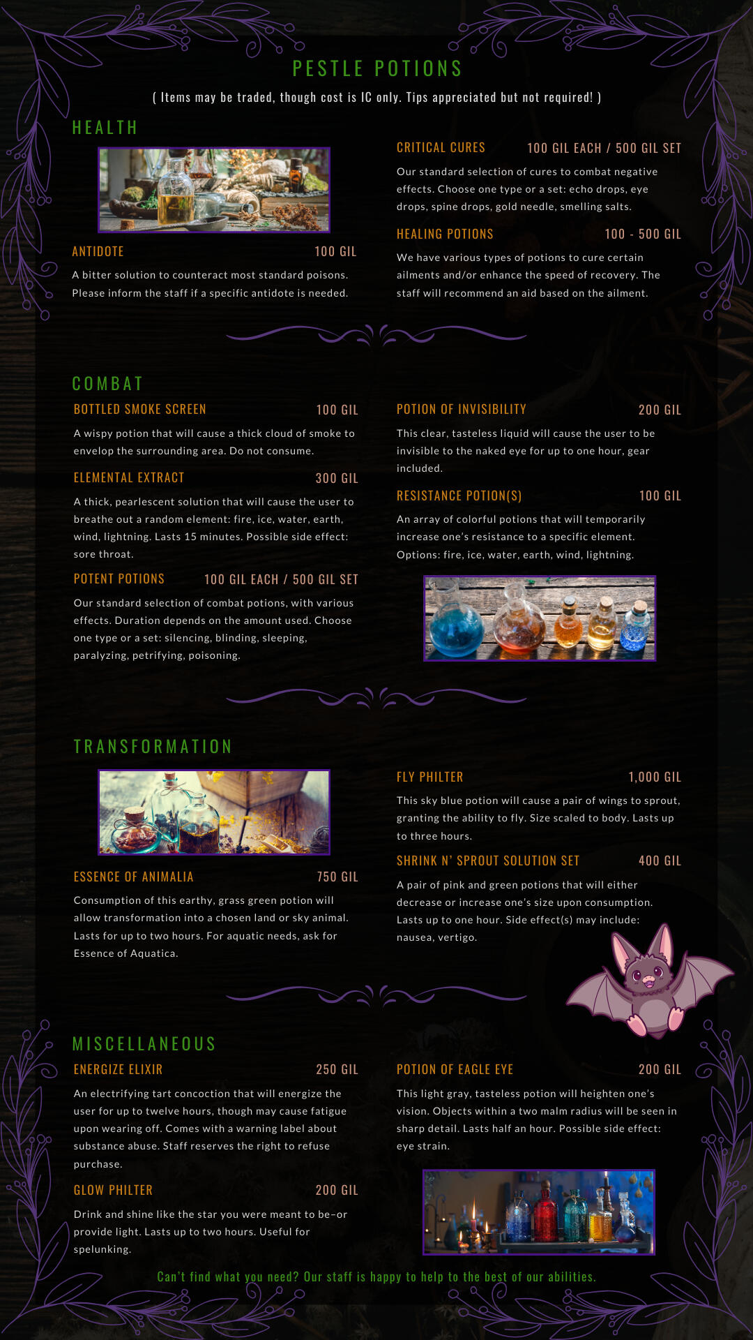 Welcome to the Poisoned Pestle apothecary, where we strive to meet all your potion needs. If what you're looking for is not in stock, there is a possibility it can be created and/or procured for you (via RP). Feel free to browse our wares and tomes, or sit down and rest your weary feet. If you're feeling adventurous, perhaps you would be interested in trying out our experimental potions?Poisoned Pestle is a part of Poison Venues, a string of establishments run by Doku. If you like night life or shopping, feel free to check out The Poison Grotto bar & lounge, or Poison & Flame relics and curios shop!