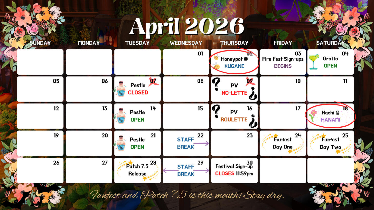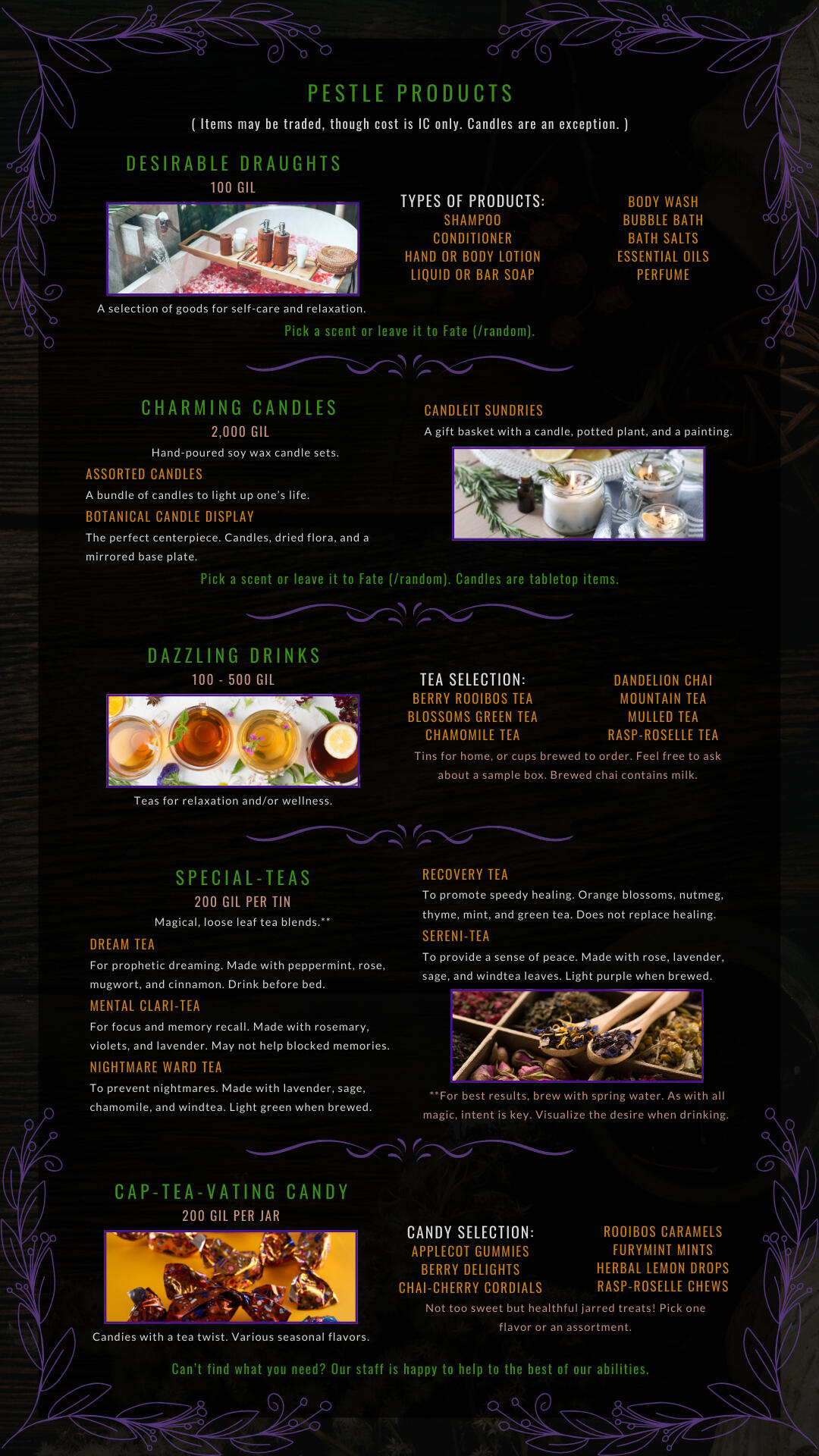 Has it been a while since your last checkup? Do you need a wound healed? Are potions not enough? Poisoned Pestle has you covered! We will work with you to the best of our abilities. While most staff members have at least some healing knowledge and experience, we now have a designated healer. No gil required, this is a free service when available.Head medic: Mina